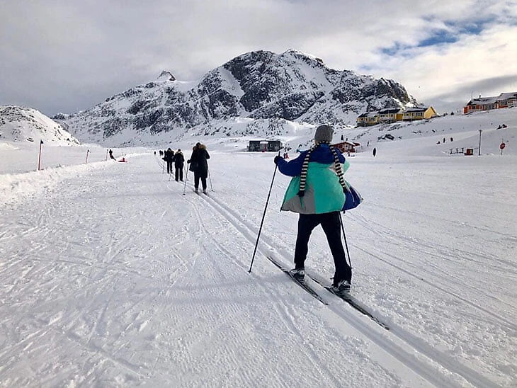 После разгонной петли в пять километров лыжня стала забирать в горы, группа моментально растянулась, впереди образовался отрыв из полутора десятков гонщиков, за который мне удалось зацепиться: лидировали пара норвежцев, выступающих за Гренландию, французский биатлонист, бывший член сборной, лыжник из эстонской марафонской команды и группа местных лыжников-инуитов – не обладая идеальной техникой классического хода, они были отлично физически готовы и цепко забегали в крутые подъемы.