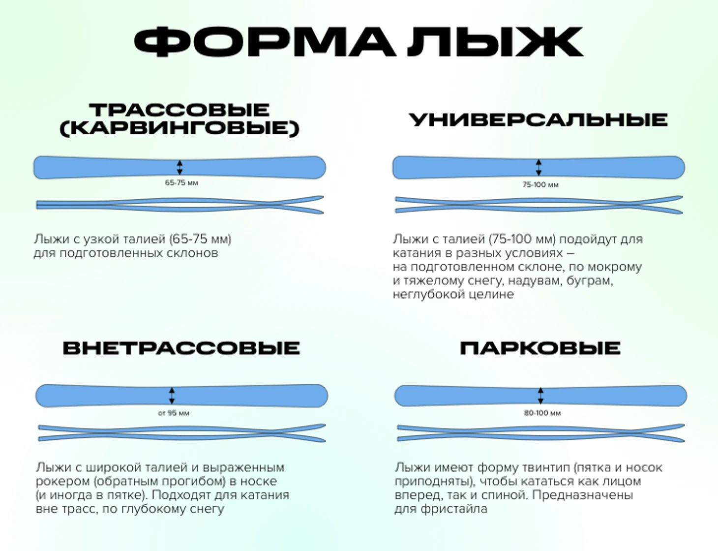 Все это влияет не только на ростовку, но и на геометрию (форма лыж), радиус выреза (соотношение талии, носка и пятки лыж, которое определяет радиус поворота; измеряется в метрах), наличие систем виброгашения.