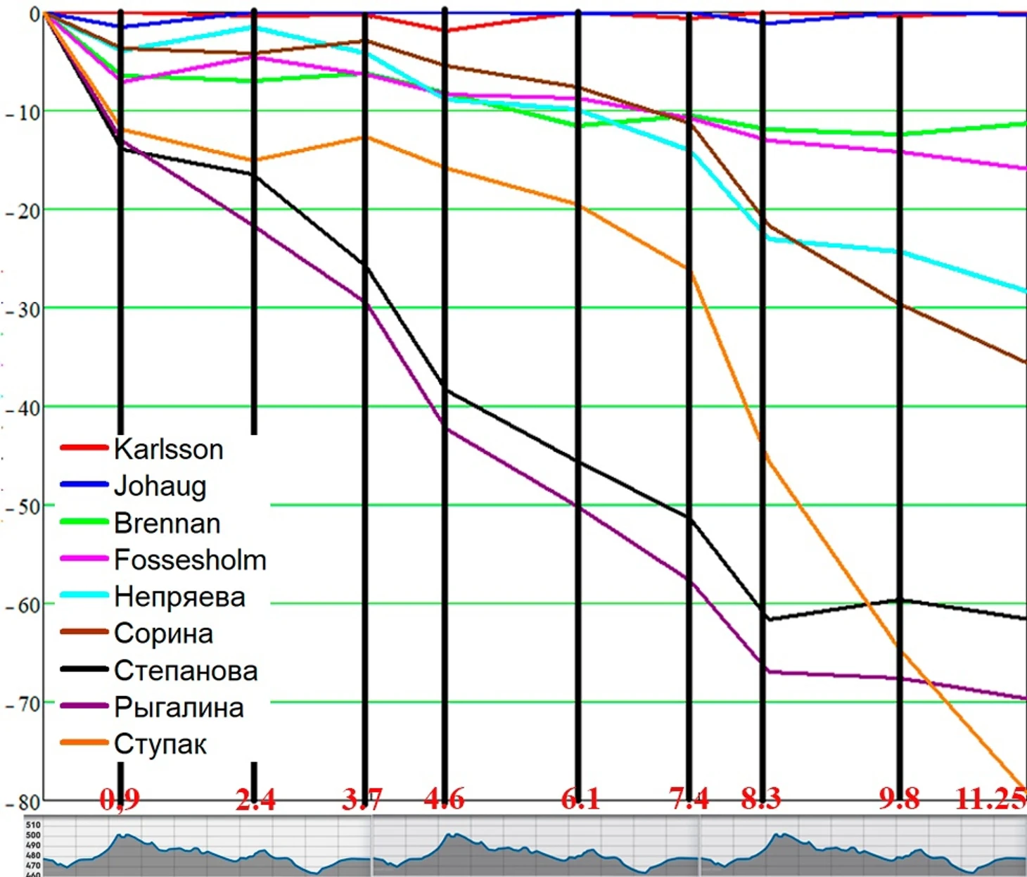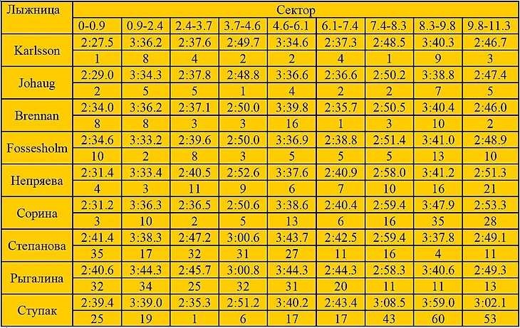 Наталья все-таки не стала упираться за Kaplsson и правильно сделала, силы распределила гораздо равномернее, в отличие от Татьяны, которая держалась за Johaug. Есть конечно смысл продержатся за топовой норвежкой и проверить себя, но потом приходится тяжко, что и вышло у Татьяны, тем не менее результат неплохой. А вот Юлия, которая держалась за Brennan, явно перестаралась с оглядкой на свою текущую форму, после 7.5к ее просто вырубило.