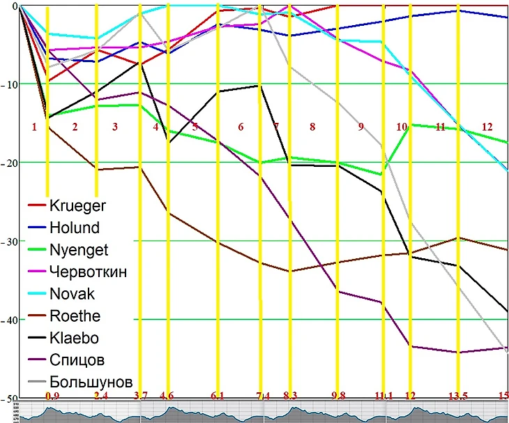 Во-вторых, посмотрим на график прохождения, Александр показал лучшие времена на секторах, где он и оставил, так получается, все свои силы. А вот сектора 2 и 5, где длинные пологие спуски, он показал время хуже Krueger`а и Holund`а, при том, что в прошлом сезоне Александр во всех 3-х разделках ни оставил никому шансов на спусках, у него отличная техника прохождения спусков, плюс его большая масса дают преимущество. Взять того же Klaebo, у него все сектора 2, 5, 8, 11 лучше чем у Большунова, потому что лыжи явно катили лучше на пологих спусках, и не приходилось делать лишних отталкиваний ногами и палками.