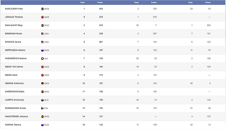 В женской гонке, уже третью разделку из трех, за викторию боролись Йохауг и Карлссон. На этот раз обладательнице желтой майки явно не хватало свежести, в связи с этим, посоперничать с четырнадцатикратной чемпионкой мира до последних отсечек ей не удалось. Зато снова отлично выглядели американки: аж три лыжницы в десятке сильнейших. Если обнаружить там, в итоге ставшей второй, Джесси Диггинс и Рози Бреннан далеко не удивительно, то шестое место Хейли Свирбул говорил либо о потрясающем прогрессе, либо об идеальных кондициях спортсменки. Для лидеров сборной России гонка вышла провальной: если на прошлом этапе Непряева и Сорина были в топ-10, то здесь уже с первых километров стало понятно, что никакой борьбы за медали даже не предвидится. На фоне таких «серых» выступлений особо интересно было последить за яркой молодежью: Никой Степановой и Женей Крупицкой. После великолепной эстафеты в Норвегии многие «хейтеры» Степановой призывали лыжницу «спуститься с небес», но в ответ она выдала лучшую личную гонку в карьере. Крупицкая же дебютировала в нынешнем сезоне, но показать удовлетворительный результат сходу не получилось. Далеко идущие выводы пока делать не будем: одну гонку провалить может абсолютно любой спортсмен.