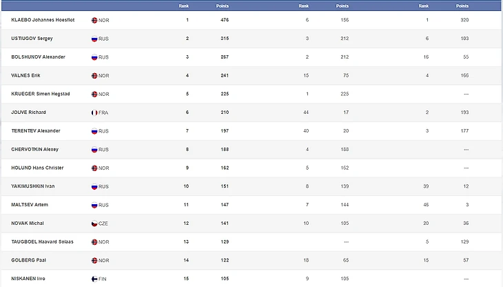 Александр Терентьев: спринт – ½. Александру совсем немного не хватило до попадания в свой первый коньковый финал в карьере. В целом, его выступления на классических гонках выглядят намного конкурентоспособнее, поэтому ждать от него повторения Руки не стоило. В любом случае, молодой лыжник сборной показывает достойные результаты в этом сезоне и заслуженно едет на олимпиаду. Оценка – 8/10.