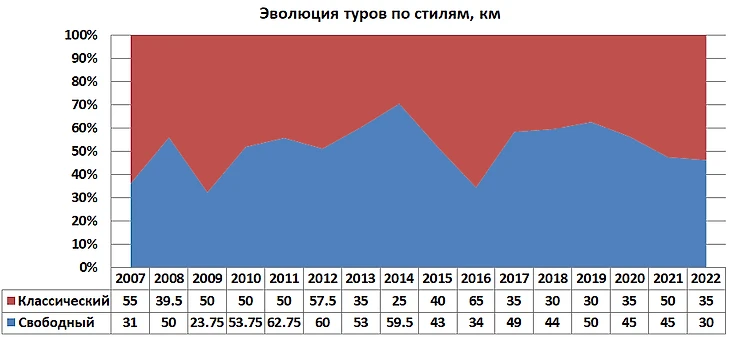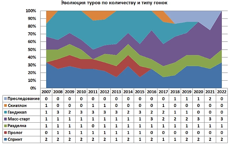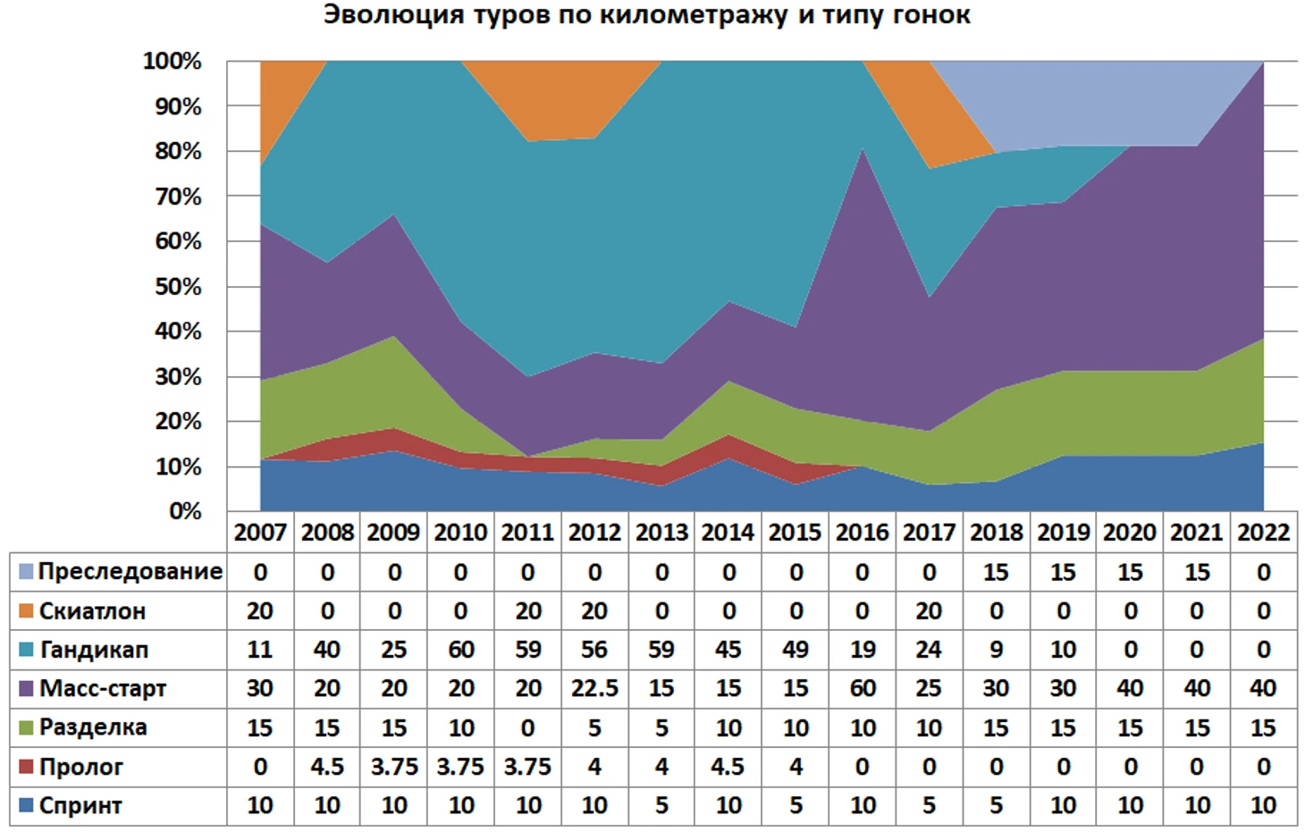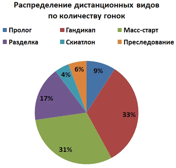 Как видим масс-старты с преследованием полностью вытеснили гандикапы, и если раньше действительно по дистанции нужно было показывать быстрое время, то сейчас все свелось к спринтам и финишному рывку, привет Тур де Спринт.