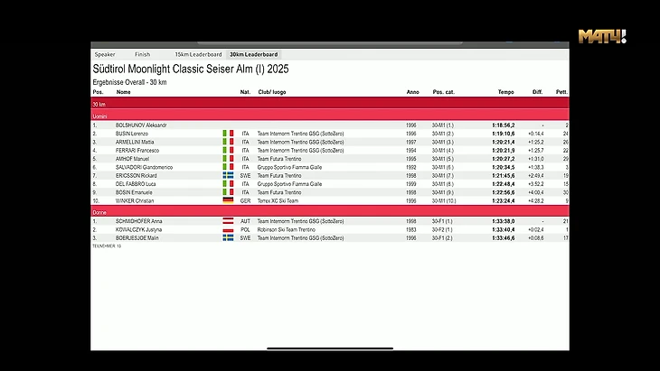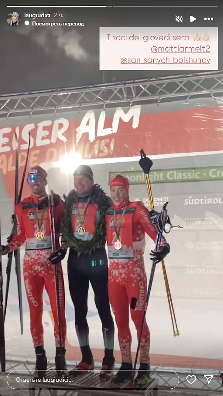 Все решилось незадолго до концовки: Большунов включился мощными движениями и не оставил шансов оппоненту. Хотя Лоренцо держался достойно и в итоге уступил лишь 14,4 секунды. Да и бронзовый призер Маттиа Армеллини (тоже итальянец) отстал чуть меньше, чем на полторы минуты.