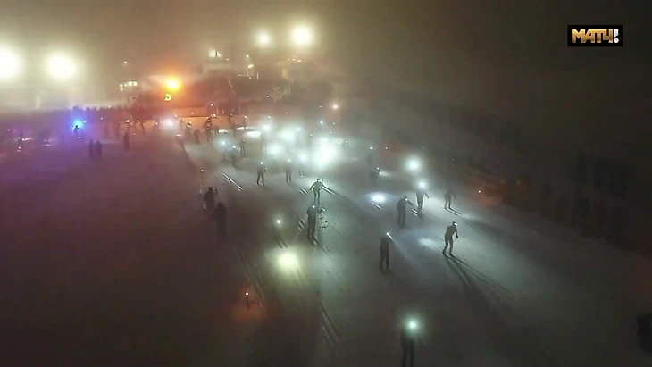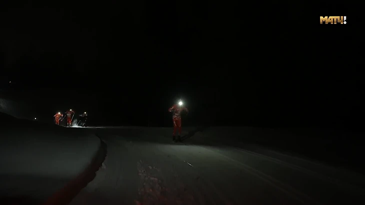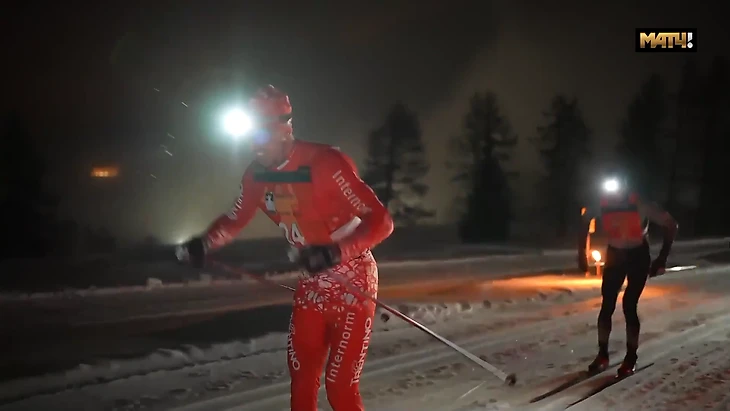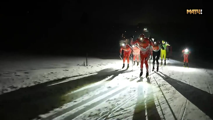 Большую часть дистанции Большунов держался в группе лидеров из четырех-пяти человек. Он выделялся собственной экипировкой, а вот опознать соперников было сложно из-за освещения и еле видимых стартовых номеров.
