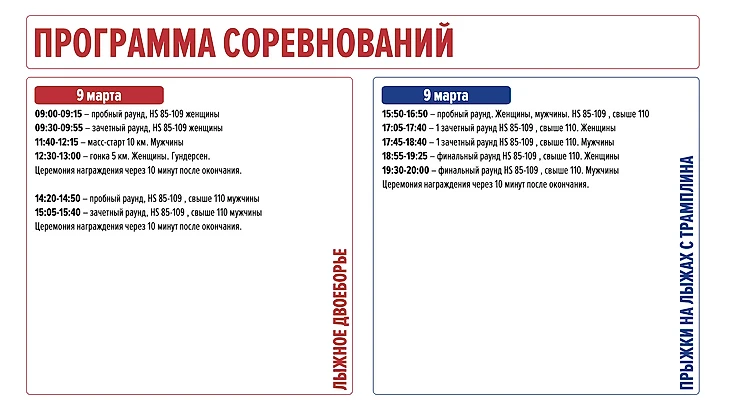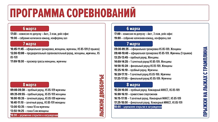Соревнования начнутся 6 марта с первых тренировок, а 7 марта — стартуют главные события, включая индивидуальные старты среди мужчин и женщин. На протяжении нескольких дней состоятся командные и смешанные соревнования, в которых примут участие лучшие атлеты не только из России, но и из других стран. Все они будут бороться за титул и право назвать себя лучшими на трамплинах К-125 и К-95.