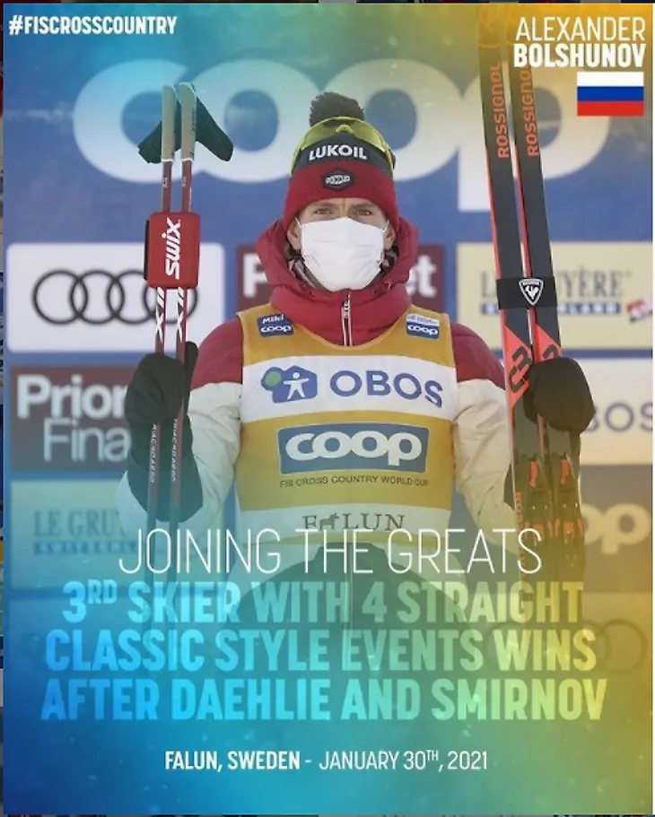 Количество побед и подиумов в сравнении с великими лыжниками, % успешных выступлений в спринте, разделках и масс-стартах, победы и подиумы в ТДС, количество побед за один сезон, максимальное количество очков за сезон.