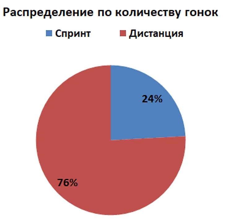 Распределение по количеству гонок, километражу, отдельно по каждому виду дистанции, по стилям передвижения, суммарный километраж и т.д.