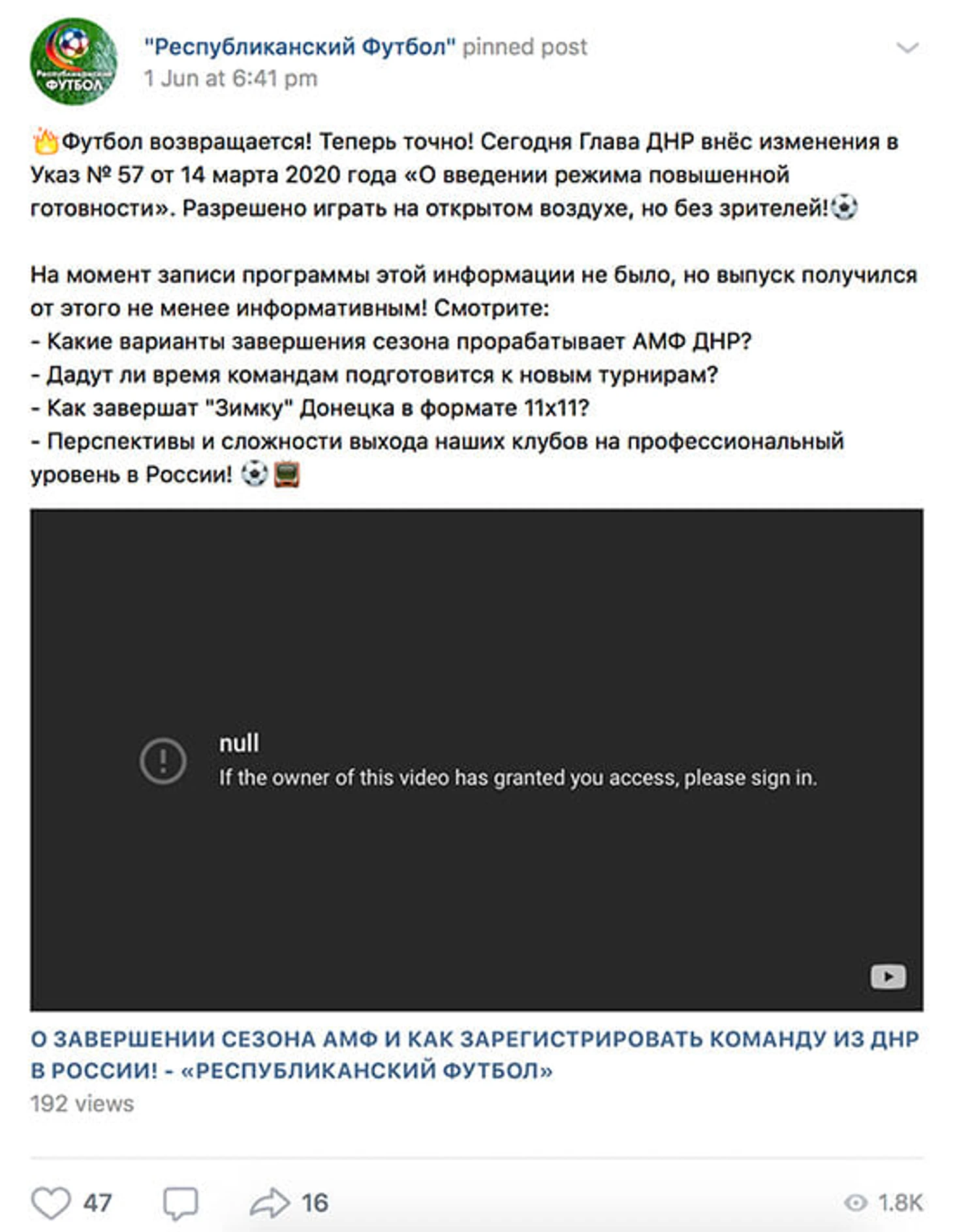 Она называлась «О завершении сезона АМФ и как зарегистрировать команду из ДНР в России», а Халваши объяснял, с какими сложностями клуб столкнулся при заявке в Высшую лигу чемпионата России – им пришлось регистрировать клуб в России, оформлять футболистов в единой информационной системе РФС и отказываться от участия основой в будущем чемпионате ДНР.
