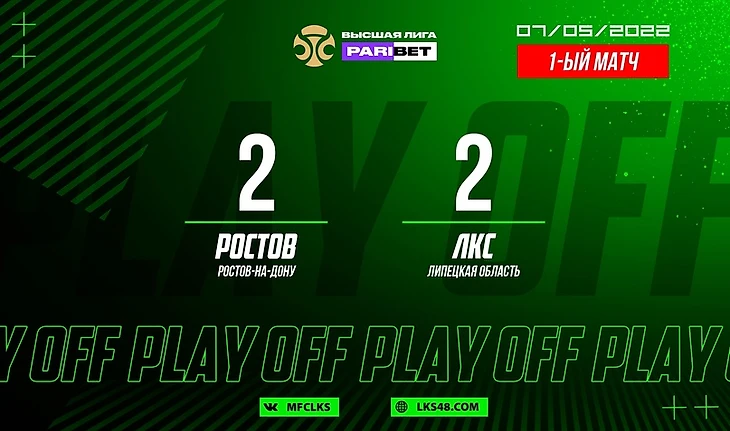Мини-футбольный клуб ЛКС 7 мая проводил первый полуфинальный матч Парибет-Высшей лиги с «Ростовом». Игра прошла в ростовском КСК «Экспресс». Хорошо знакомые команды встречались уже в четвёртый раз в этом сезоне. Первые три противостояния остались за липчанами, победившие ростовчан в Кубке России и дважды в регулярном Первенстве. Однако матчи плей-офф – это особый настрой и накал страстей, тем более, когда на кону – медали Высшей лиги.