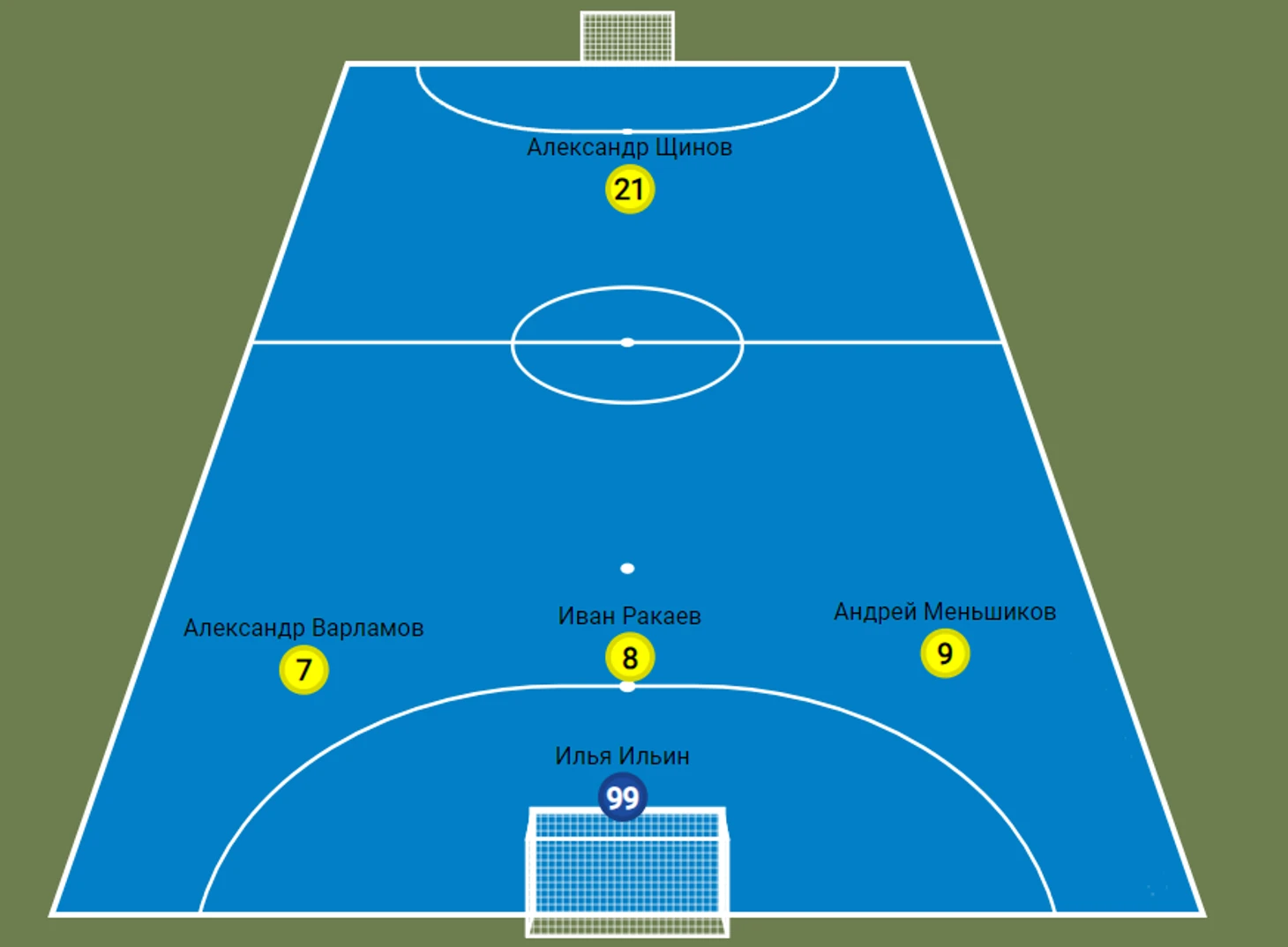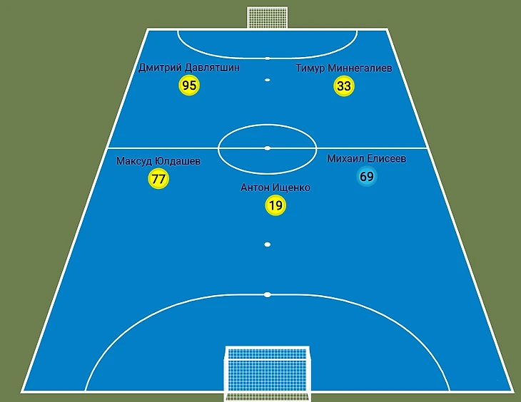 Михаил Елисеев - разыгрывающий, при необходимости край, а иногда даже и голкипер (поэтому на схеме обозначен в качестве пятого полевого). Шустрый, техничный, в хорошей форме явно способный усилить любой клуб лиги. Сейчас в Санкт-Петербурге. Если вернётся в течение чемпионата - может появиться в одном из матчей команды.