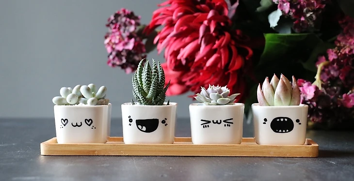 компактные комнатные растения, например, суккуленты в стильных горшках.