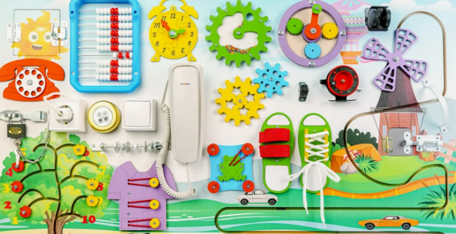 Бизибордов сейчас продается большое количество и с самым разнообразным дизайном. Малышу будет интересно трогать и двигать различные предметы, тем самым развивая свои тактильные навыки. Бизиборды есть и надувные, которые можно взять с собой куда угодно.