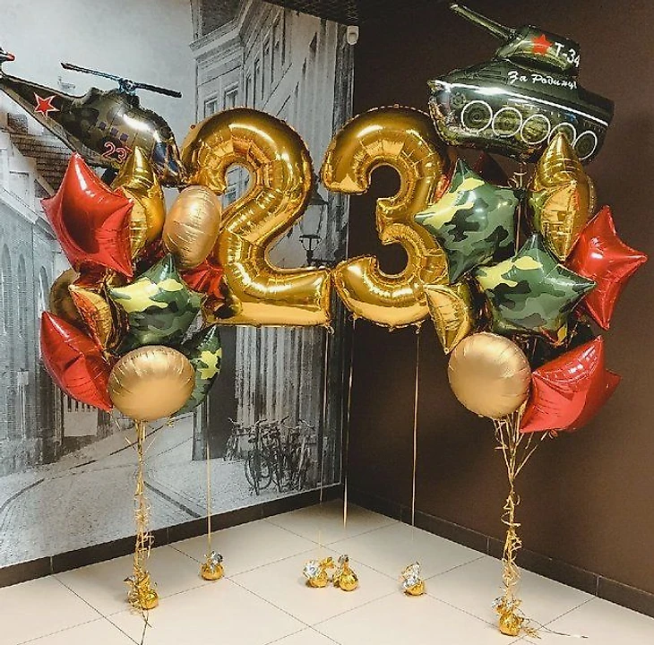 Не забывайте о воздушных шарах! Они привнесут нотки веселья, легкости в оформление. Приобретите красные, синие, белые шары. Комбинируйте размеры и формы – круглые, сердечки, фигурные. Создайте композиции из шаров, которые будут напоминать военные символы, например, звезды, танки. Развесьте по комнате, разместите в углах.