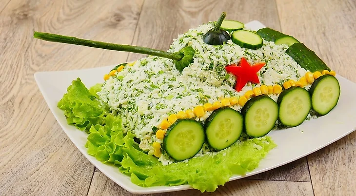 Подумайте о тематических закусках. Например, маленькие закусочные флажки с названиями блюд. Это будет не только вкусно, но и очень оригинально! Ещё как вариант – приготовьте салат в форме танка.
