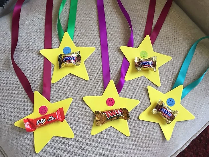 Самое простое – символические награды, причем сделать эти подарки своими руками труда не составит. Напечатайте на принтере обыкновенные грамоты: самому ловкому, быстрому, сильному, умному и т.п. В качестве приза можно раздавать значки, их легко приобрести в маркетплейсах, только делать это нужно заранее. Медали следует изготовить собственноручно, понадобится только лента, клей и плотная бумага.