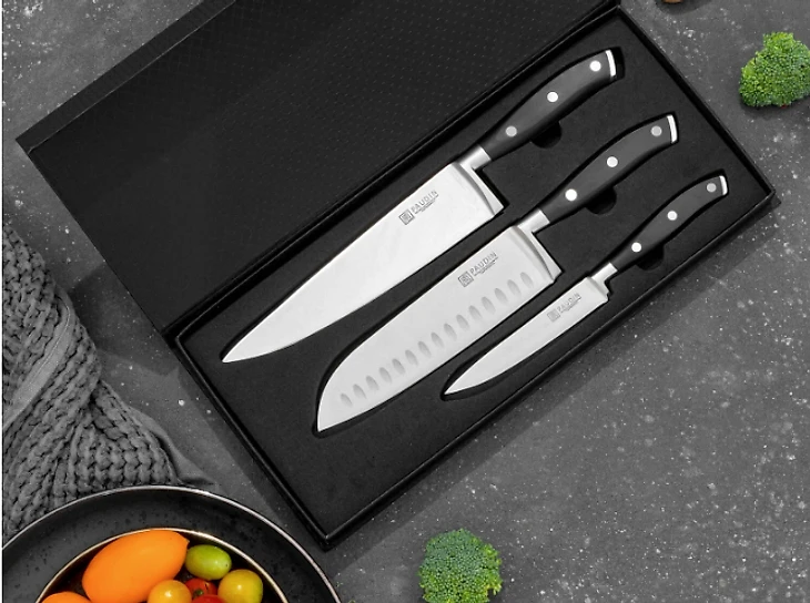 Набор профессиональных ножей. 3 разноразмерных ножа Paudin из долговечной немецкой стали порадуют любителя что-либо приготовить на кухне. У ножей удобные нескользящие ручки, что безопасно при использовании. А сложены ножи в элегантный подарочный бокс черного цвета.