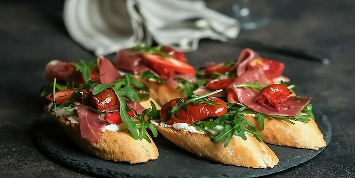 Брускетта с творожным сыром, вяленым томатом и беконом