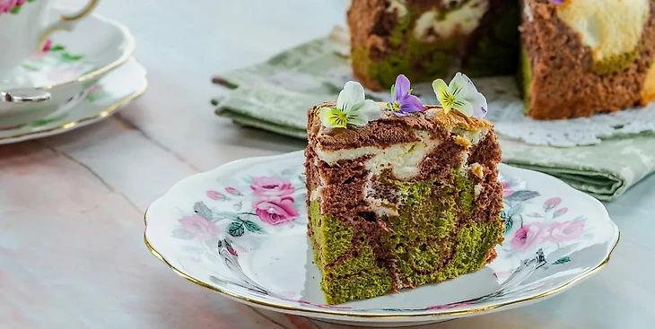 Разделите тесто на три части. Одну смешать с какао, вторую с матчей, а третью оставить без изменений. В форму для кекса небольшими порциями выливаем тесто разных цветов. Выпекать в духовке 35-45 минут.