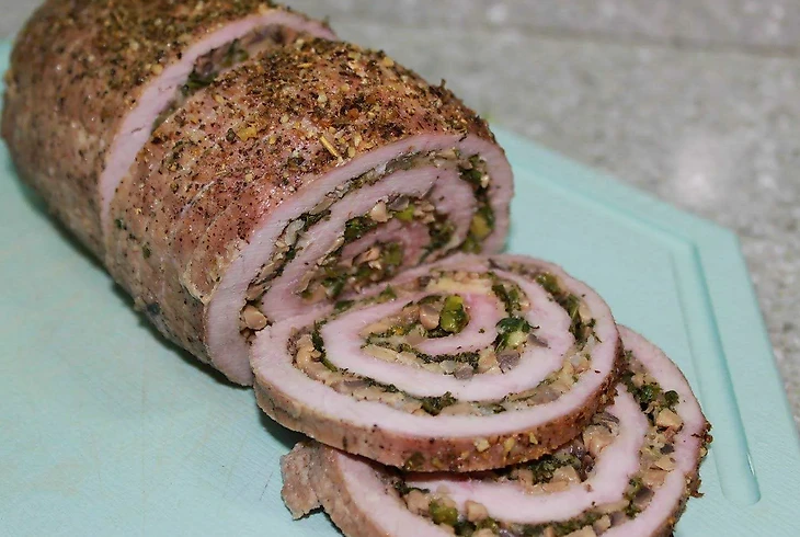 Мясной рулет с начинкой. Это очень сытное основное блюдо, которое готовится просто. Для рецепта лучше всего брать свиную шею, тогда рулет получится сочным, а мясо будет нежным. Стоит отказаться от карбонада, из него рулет будет сухим.