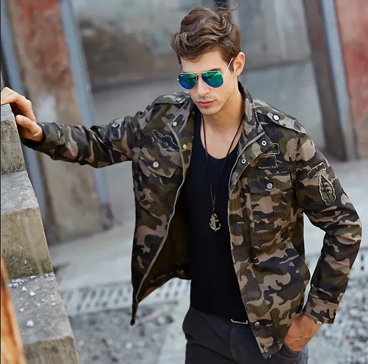 Военный стиль — это самый простой и доступный формат. В магазинах в большом количестве представлена одежда, напоминающая военную. Вы можете купить камуфляжные брюки, рубашку цвета хаки или футболку с военным принтом, куртку-бомбер или пиджак. Как головной убор можно использовать берет или кепку. Чтобы внешний вид был более цельным стоит купить армейские ботинки и отказаться от кроссовок.