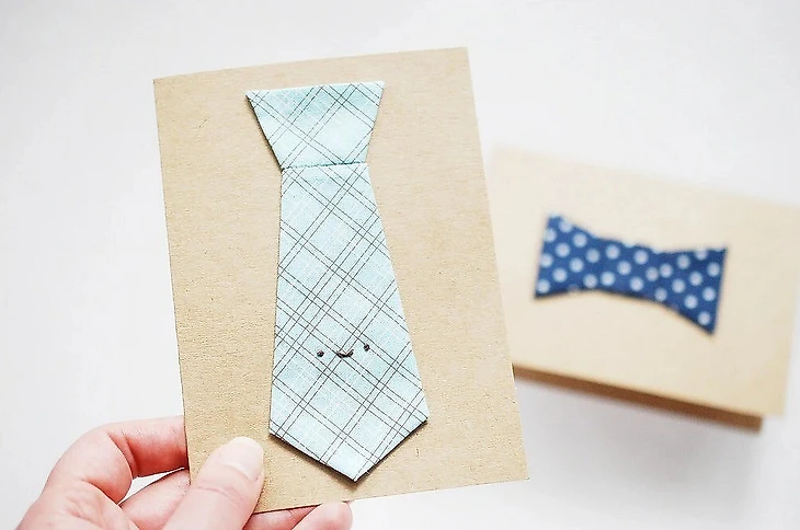 В качестве подарка можно сделать открытку с галстуком или галстуком-бабочкой. Надо будет подготовить небольшие лоскуты ткани и картон. Шаблоны аппликации можно распечатать или нарисовать. Далее вырезать и сделать аналогичные из ткани, но уже с припуском по 1 см. На каждый шаблон приклейте ткань, а припуски подверните на изнаночную сторону и закрепите иглой и ниткой небольшими стежками.