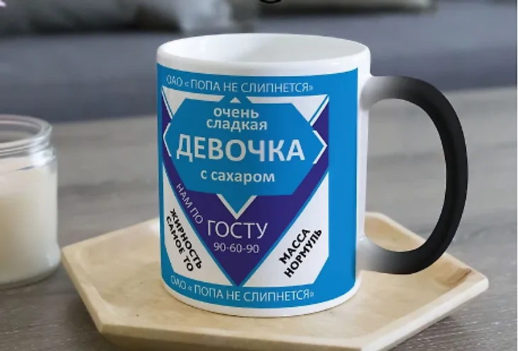 • Кружка-хамелеон с тайным рисунком – проявляется только при нагреве. Яркий принт кружки не стирается со временем. Она долго сохраняет тепло напитка, устойчива к перепадам и высокой температуре. Кружка объемом 300 мл и высотой 9.5 см. Ее нельзя мыть жесткой губкой и в посудомойке. Сама кружка черного цвета и когда в нее наливаешь горячую воду (выше 55 градусов), на ней появляется рисунок.