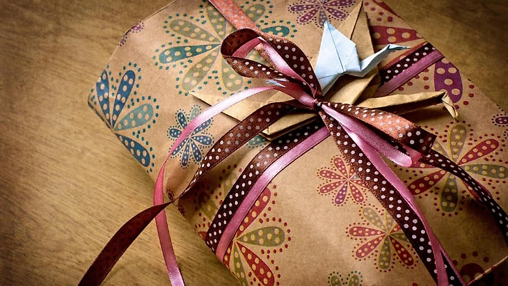 Оформите самостоятельно упаковку подарка. Для этого можно использовать живые цветы, которые можно зафиксировать с помощью клея или привязать лентой. Можно нарисовать рисунок на упаковке из крафтовой бумаги, дополнить декор наклейками, стразами, еловыми ветками или сухими листьями.