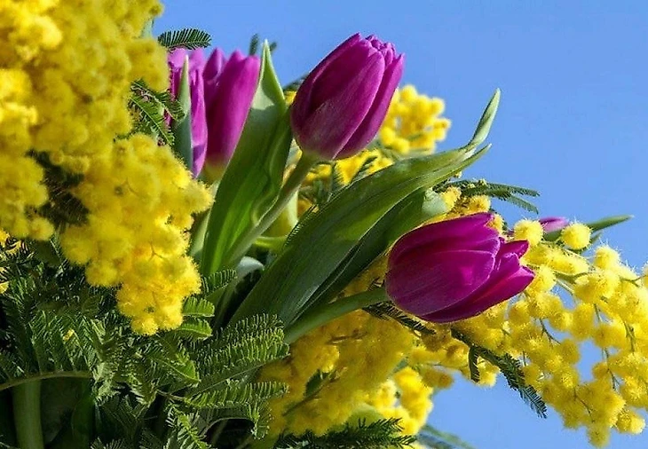 Мимозы. Это еще один символ весны и 8 Марта. Мимоза ассоциируется с женственностью и грацией, часто становится частью поздравлений на 8 Марта. Ограничений по включению в букеты нет, поэтому мимозу можно подарить как коллегам по работе, так и маме, бабушке или жене.