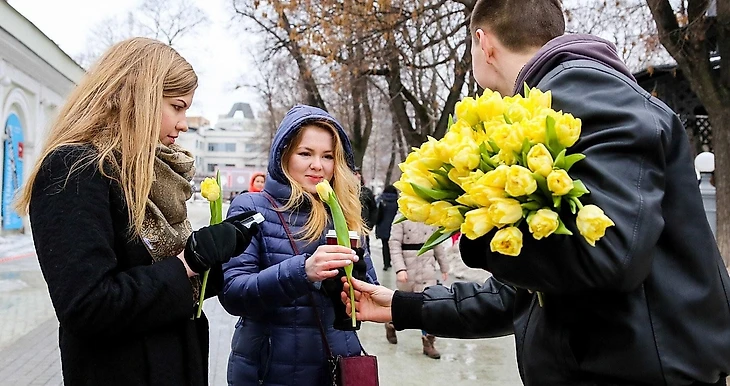 Тайное вручение цветов случайным прохожим. Перед 8 Марта в социальных сетях появляется много роликов, в которых прохожим девушкам и женщинам дарят цветы, конфеты или другие подарки. Присоединяйтесь к тренду, чтобы поздравить с праздником незнакомых людей.