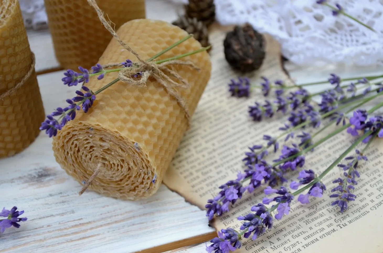 Начните аккуратно закручивать вощину, помещая фитиль в центр. Обратите внимание на то, чтобы полоса сворачивалась плотно и равномерно — это обеспечит стабильность свечи и ее качественное горение.