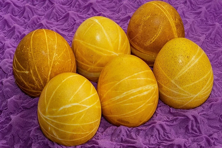 Куркума придает яркий желтый цвет. Для этого смешайте 2 ст. ложки куркумы с 1 литром воды и прокипятите в течение 20 минут. Добавьте яйца и варите еще 10-15 минут.