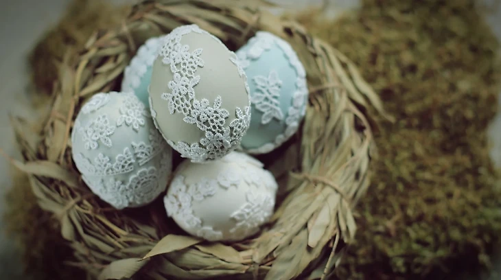 Вырежьте кусочки ткани и оберните ими поверхность скорлупы, закрепив клеем или тесьмой. Перевяжите кружевом.