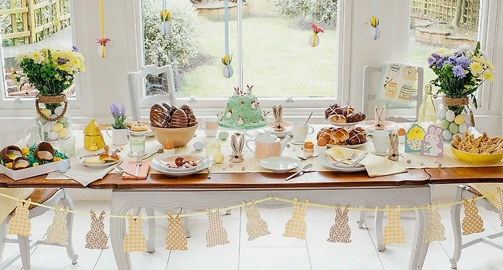 Начните с веселой скатерти с весенним принтом — цветы, зайцы или яйца отлично подойдут. Используйте пластиковую посуду ярких цветов, чтобы избежать неприятностей с разбитыми тарелками.