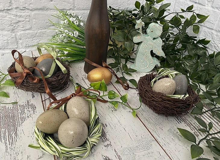 Яйца в нитках – возьмите обычные яйца и обмотайте их цветными нитками. Это займет всего несколько минут, а результат будет впечатляющим. Используйте яркие цвета для весеннего настроения или пастельные для более сдержанного стиля.