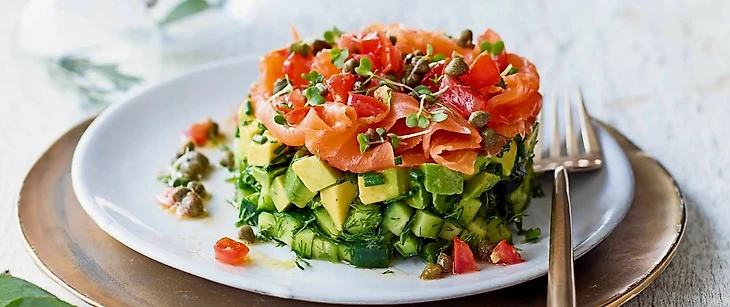 Подготовьте лосося, авокадо и огурец, нарезав их аккуратными кубиками.