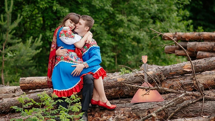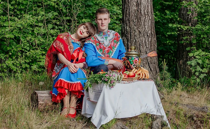 Мы подобрали для вас примеры удачных кадров. Например, влюбленная пара в русском народном стиле на природе. На столе самовар, баранки и полевые цветы, которые создают непринужденную атмосферу уюта. Естественный свет и живой фон подчеркивают искренность момента и глубину чувств.