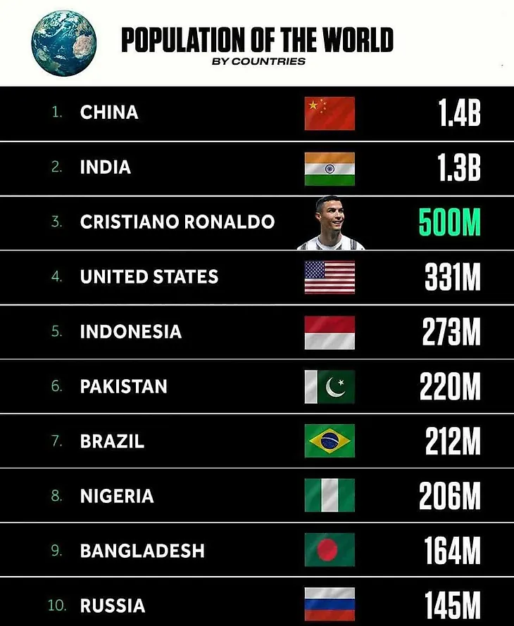 Роналду по подписчикам в социальных сетях, обходит бóльшую часть стран земного шара, уступая лишь двум государствам🌏
