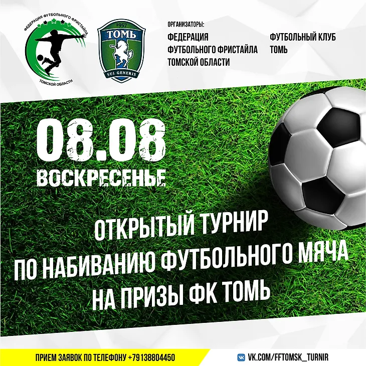 Организаторы турнира: Федерация футбольного фристайла Томской области и ФК Томь проводят открытый турнир по чеканке футбольного мяча.