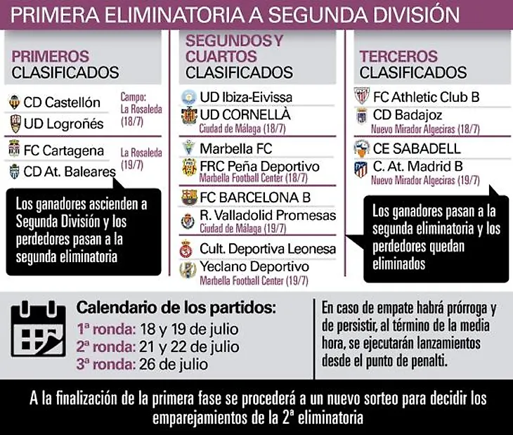 Сегодня в Марбелье Королевская испанская футбольная федерация провела жеребьевку экспресс плей-офф за повышение в Сегунду, который состоится 18-26 июля. В первом раунде второй команде «Барсы» предстоит сражение со второй командой «Вальядолида», матч пройдет 19-го июля.