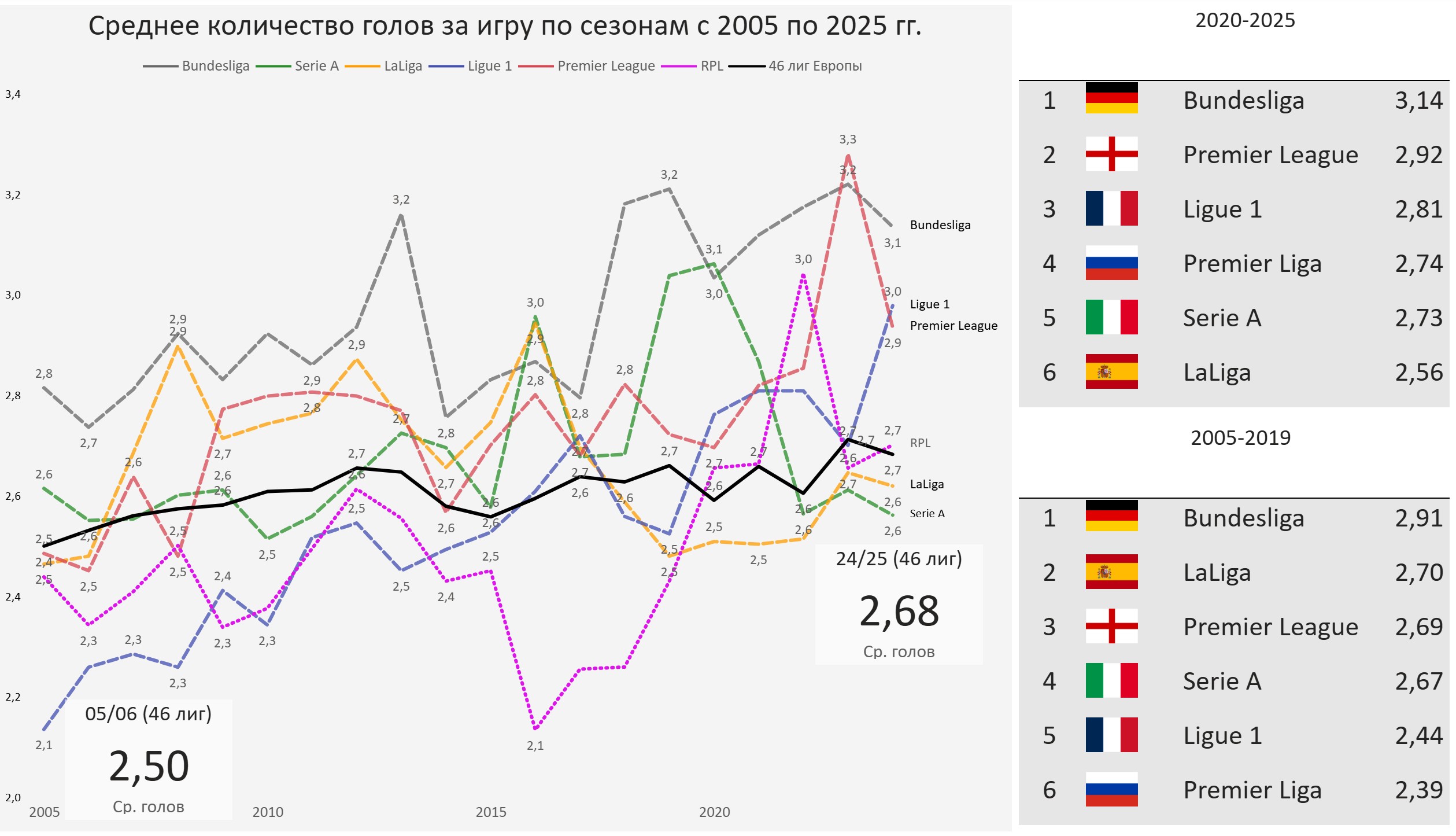Moneyball: графики и метрики / РПЛ догнала и перегнала Европу по голам: cтатистика 46 лиг с 2005 по 2025