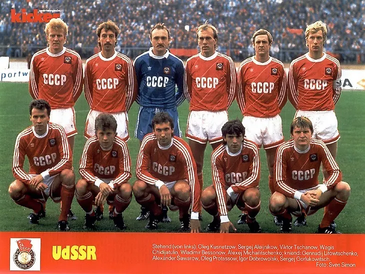 1989г. СССР - ГДР. Сб. СССР, слева-напр, сидя: Добровольский - О.Кузнецов - Протасов - Заваров - Рац. Стоя: Михайличенко - Дасаев - Литовченко - Алейников - Лужный - Горлукович. В условиях уже наступающего Объединения Германии, команда ГДР психологически была уже явно не в самом своём боеспособном и «мотивированном» состоянии...что, конечно же, очень сыграло тогда на руку команде СССР... А вот на Чемпионате Мира, в следующем, 1990 году, Сборная СССР (под рук.Лобановского) была, уже в стартовых матчах...начисто деклассирована: вначале Румынией, а затем и Аргентиной (особенно показательно!..)