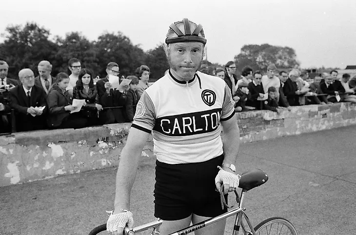Сегодня расскажу о пожалуй самом удивительном возвращении в истории велоспорта. Это англичанин Рег Харрис (Reg Harris), неоднократный в прошлом чемпион мира, уважаемый человек. На дворе 1971 год, Харрису 54 и спустя четырнадцать лет после выхода на пенсию он решил побороться за национальный титул чемпиона в спринте. Это как если бы Президент федерации велоспорта России Вячеслав Екимов решил бы вернуться на трек и попробовать катнуть на чемпионате страны.