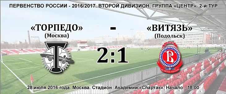 В матче второго тура первенства России – 2016/2017 среди команд второго дивизиона в группе «Центр» московское «Торпедо» праздновало волевую победу над подольским «Витязем». О том, как это было, наш материал.