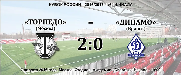 В матче 1/64 финала Кубка России «Торпедо» со счётом 2:0 переиграло брянское «Динамо» и в 1/32 финала примет представителя ФНЛ - саранскую «Мордовию».