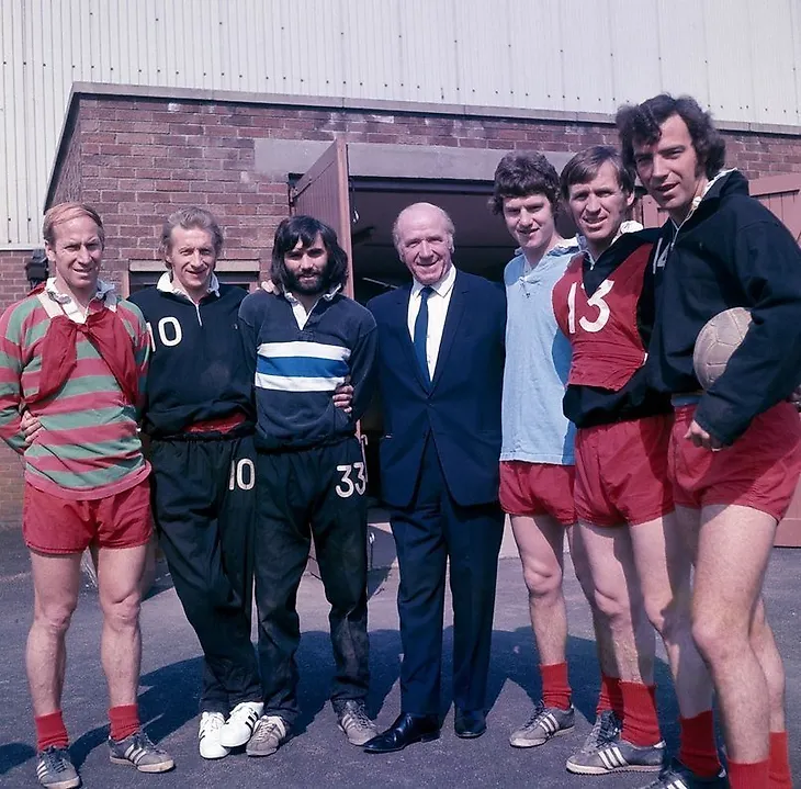 Бобби Чарльтон,Денис Лоу,Джордж Бест,Сэр Мэтт Басби,Брайан Кидд,Пэт Креранд и Дэвид Сэдлер.