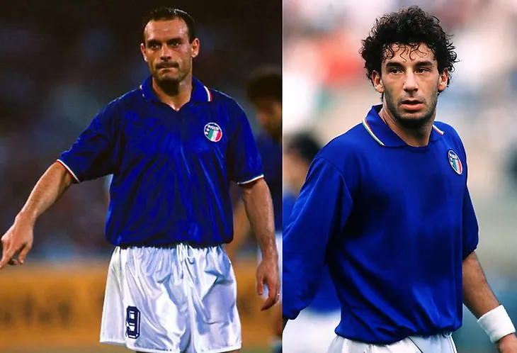 ЧМ-1990г. Сальваторе СКИЛЛАЧИ - Лучший Бомбардир ЧМ-1990 (слева) и Жан-Лука ВИАЛЛИ - Основной Тандем форвардов Сборной Италии на её домашнем Чемпионате Мира-1990 (Его оптимальнось тогда не смог поколебать и нарушить, даже такой многоплановый форвард, да и просто Гениальный Игрок, как Роберто БАДЖО!..)