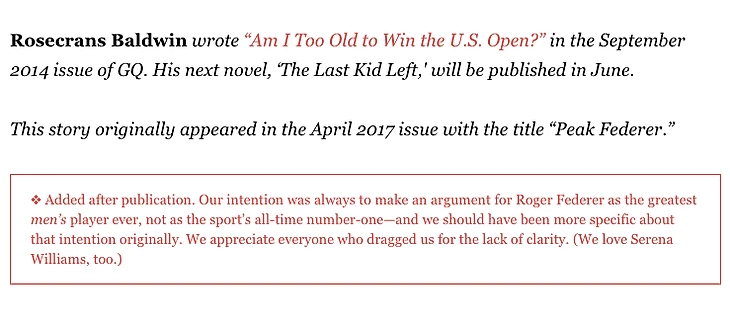 «Мы говорили о Роджере Федерер исключительно как о лучшем теннисисте-мужчине, а не лучшем среди игроков обоих полов, и нам стоило выразиться более четко. Мы благодарны всем, кто сделал нам нагоняй за недостаточную ясность мысли. (Мы тоже любим Серену Уильямс.)»