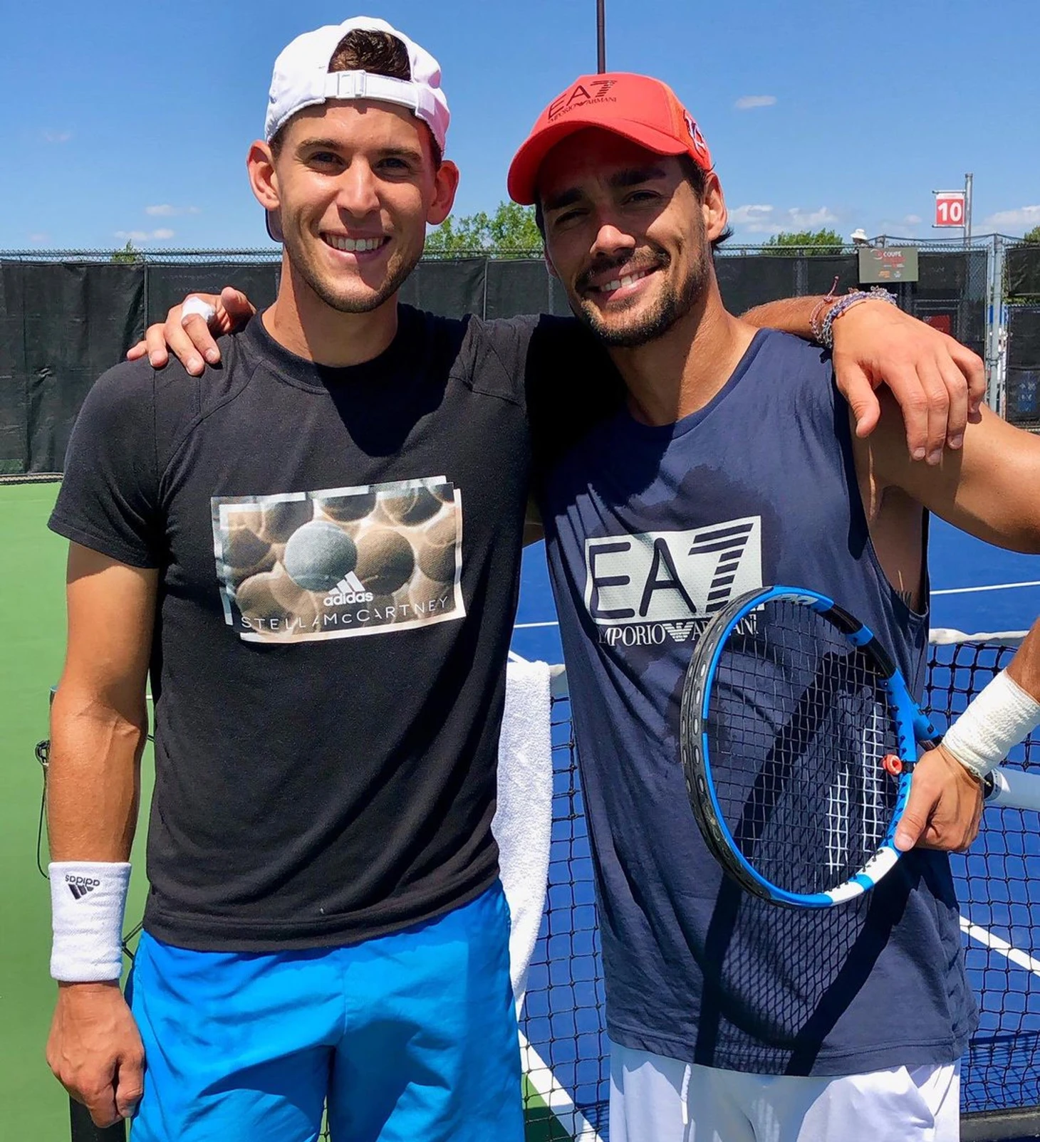 11-я ракетка мира Фабио Фоньини готовится к старту турнира в Монреале с четвертой ракеткой Домиником Тимом.