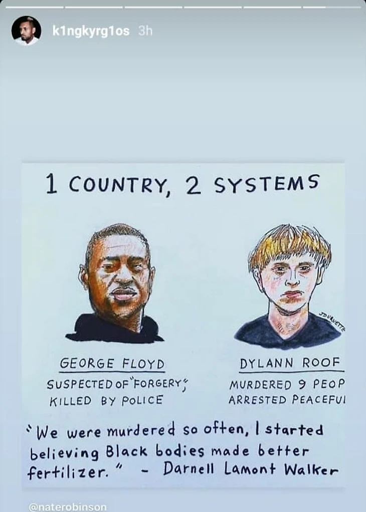 «Это ######. Что не так с этим миром? Почему мы так поступаем друг с другом?» – написал австралиец. Также он репостнул запись «1 страна, 2 системы», в которой смерть Флойда противопоставляется аресту Дилана Руфа, убившего девять человек и не пострадавшего в ходе задержания.